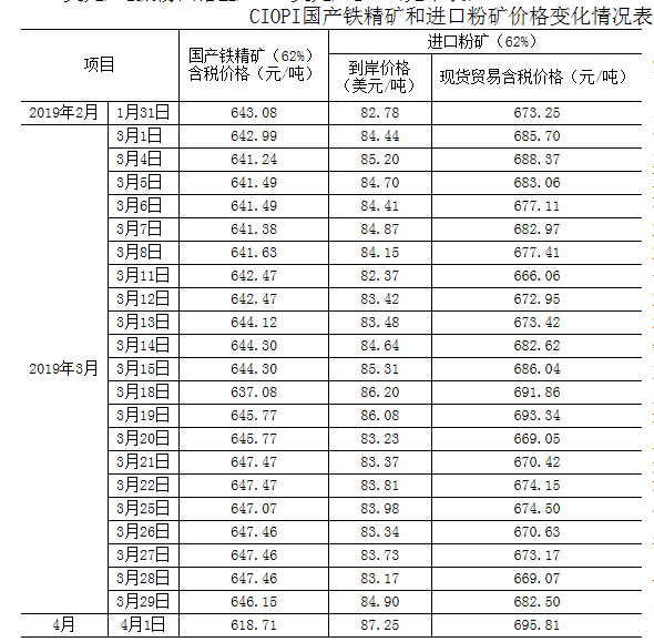 从全月平均水平看,国产铁精矿平均含税价格为644.14元/吨,比上月下降0.07元/吨,降幅为0.01%,基本保持平稳。进口粉矿平均到岸价格为84.23美元/吨,比上月下降1美元/吨,降幅为1.18%。其中:3月1日至3月18日,由84.44美元/吨上行至86.20美元/吨,3月18日至3月末,由86.20美元/吨振荡回落至84.90美元/吨。(见下表)