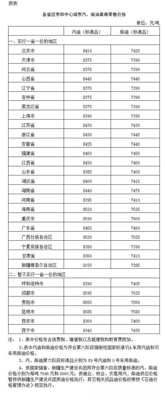 根据近期国际市场油价变化情况,按照现行成品油价格形成机制,自2019年6月11日24时起,国内汽、柴油价格(标准品,下同)每吨分别降低465元和445元。调整后,各省(区、市)和中心城市汽、柴油最高零售价格见附表。相关价格联动及补贴政策按现行规定执行。