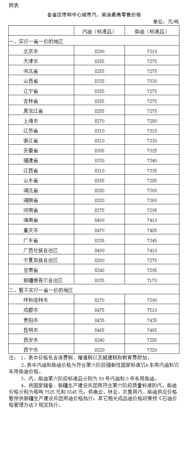 根据近期国际市场油价变化情况,按照现行成品油价格形成机制,自2019年6月25日24时起,国内汽、柴油价格(标准品,下同)每吨分别降低120元和115元。调整后,各省(区、市)和中心城市汽、柴油最高零售价格见附表。相关价格联动及补贴政策按现行规定执行。