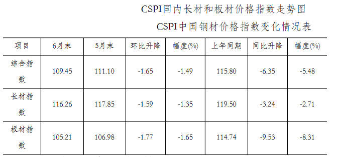 6月末,钢铁协会CSPI中国钢材价格指数为109.45点,环比下降1.65点,降幅为1.49%,降幅较上月加大0.1个百分点;同比下降6.35点,降幅为5.48%。(见下图)
