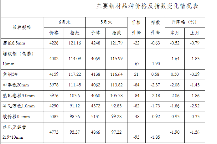 从全月情况看,6月份CSPI中国钢材价格指数平均值为108.99点,比5月份平均值下降2.94点,降幅为2.62%。