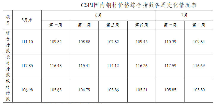 6月份,CSPI国内钢材价格指数在前三周持续小幅下降,第四周有所回升;进入7月份,第一周价格继续上升,第二周小幅回落。(见下表)