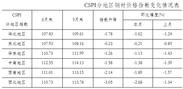 据钢铁协会监测,6月份,CSPI全国六大区域市场价格指数均继续下降,其中:西北地区降幅较大,环比下降2.68%;东北地区降幅较小,环比下降0.21%;华北、华东、中南和西南地区价格指数环比分别下降1.62%、1.13%、1.38%和1.89%。(见下表)