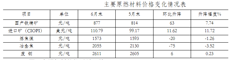 6月份,铁矿石价格继续呈上升走势。6月末,国产铁精矿和进口铁矿环比分别上63元/吨和11.62美元/吨,升幅分别为7.74%和11.72%,分别较上月末升幅加大1.25和4.92个百分点;炼焦煤和冶金焦价格由升转降,环比分别下降20元/吨和75元/吨;废钢价格小幅上升,环比上升6元/吨。与上年同期相比,国产矿、进口矿价格分别同比上升46.66%和71.05%,废钢价格同比上升10.64%,炼焦煤价格上升3.62%,冶金焦价格下降10.54%。从总体情况看,铁矿石价格快速、大幅上涨,推动钢铁生产成本继续上升。(见下表)