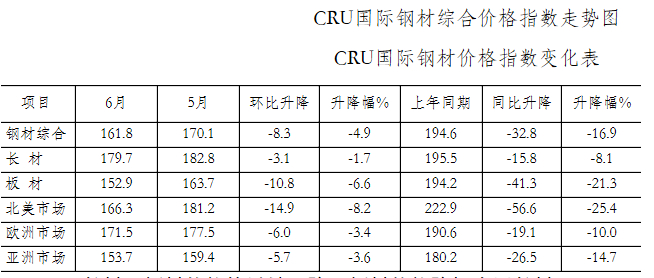 6月,CRU国际钢材综合价格指数为161.8点,环比下降8.3点,降幅为4.9%,环比继续下降,降幅较上月加大2.2个百分点;与上年同期相比下降32.8点,降幅为16.9%。(见下图、表)