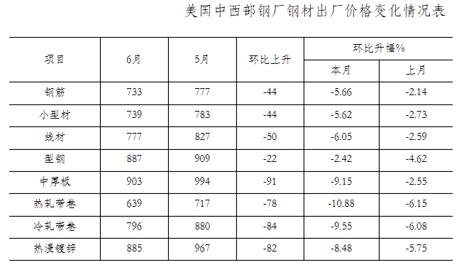 6月,CRU北美钢材价格指数为166.3点,环比下降14.9点,降幅为8.2%,降幅较上月加大2.9个百分点;6月份,美国制造业PMI为51.7%,环比下降0.4个百分点。其中新订单指数为50.0%,环比下降2.7个百分点;本月美国中西部钢厂出厂价格均继续下降,除型钢价格环比降幅较上月收窄外,其他品种钢材价格降幅均较上月有所加大。(见下表)