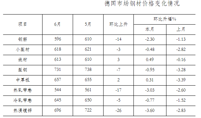 6月,CRU欧洲钢材价格指数为171.5点,环比下降6.0点,降幅为3.4%,降幅较上月加大1.5个百分点。欧元区制造业连续第5个月恶化,6月份PMI终值为47.6%,环比下降0.1个百分点。德国制造业PMI为45.0%,意大利制造业PMI为48.4%,西班牙制造业PMI为47.9%,均低于50%荣枯水平;法国制造业PMI为51.9%,环比上升1.3个百分点。本月德国市场线材和中厚板价格由降转升,小型材、型钢和冷轧带卷价格环比降幅收窄,钢筋、热轧带卷和热浸镀锌价格环比降幅加大。(见下表)