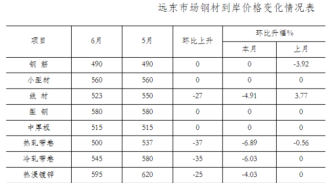 6月,CRU亚洲钢材价格指数为153.7点,环比下降5.7点,降幅3.6%,降幅较上月加大1.9个百分点。6月份,日本制造业PMI为49.3%,环比下降0.3个百分点;韩国制造业PMI为47.5%,环比下降0.9个百分点;中国制造业PMI为49.4%,环比持平。其中新订单指数为49.6%,比上月下降0.2个百分点。本月远东市场钢筋、小型材、型钢和中厚板价格保持平稳,线材价格由升转降,热轧带卷、冷轧带卷和热浸镀锌价格有所下降。(见下表)