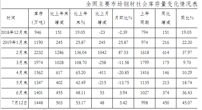 6月份,钢材社会库存由降转升。6月末升至1401万吨,环比增加53吨,增幅为3.94%。进入7月份以来,钢材库存继续上升,截止7月12日已连续五周上升,升至1448万吨,比6月末增加48万吨,增幅为3.42%。从具体品种看,长材中的钢筋及线材库存分别增加23万吨和12万吨,热轧板及中厚板增加14万吨,冷轧板下降0.33万吨。长材及热轧板库存增加,后期市场压力较大。(见下表)