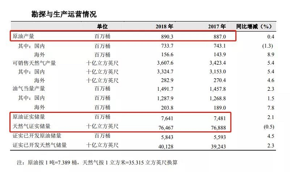 中石油的年报显示,2018年集团原油产量890.3百万桶,比上年同期增长0.4%;可销售天然气产量 3,607.6 十亿立方英尺,比上年同期增长 5.4%,油气当量产量 1,491.7 百万桶,比上年同期增长 2.3%。