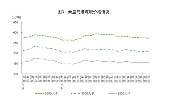煤炭价格平稳。9月6日,秦皇岛5500大卡煤炭综合交易价格为每吨569元,5000大卡为每吨508元,比8月初分别回落8元和3元;4500大卡为每吨454元,与8月初持平。