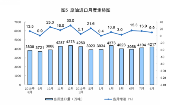 8月份,进口原油4217万吨,同比增长9.9%,增速比上月回落4.0个百分点。1—8月份,进口原油32780万吨,同比增长9.6%。