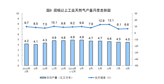 8月份,生产天然气138亿立方米,同比增长6.6%,增速比上月加快0.5个百分点;日均产量4.5亿立方米,与上月持平。1—8月份,生产天然气1141亿立方米,同比增长9.3%。