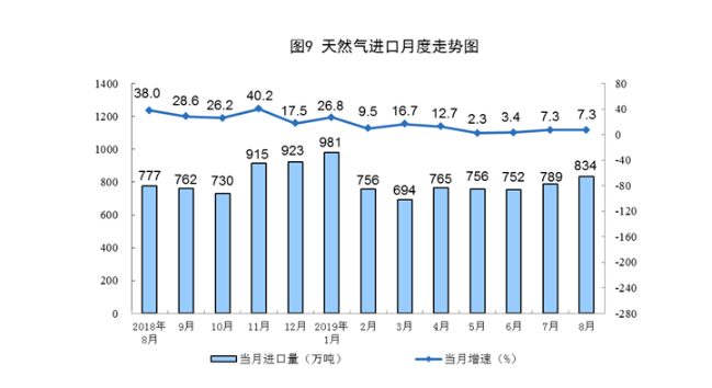 8月份,进口天然气834万吨,同比增长7.3%,增速与上月持平。1—8月份,进口天然气6304万吨,同比增长10.3%。