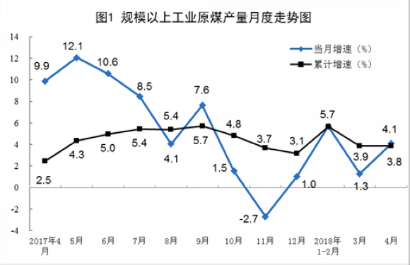 4月份,原煤产量同比增长4.1%,比上月加快2.8个百分点。1-4月份,原煤产量11.0亿吨,同比增长3.8%。