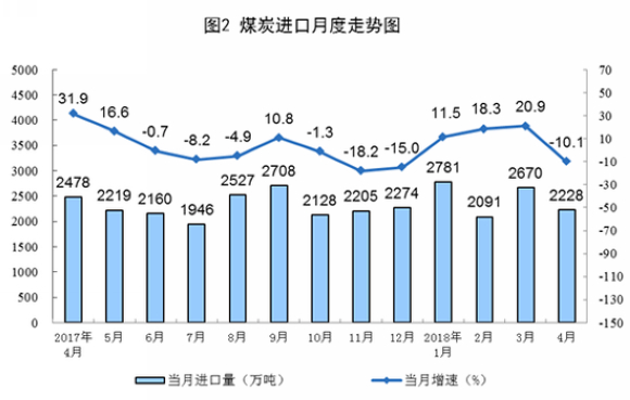 煤炭进口大幅下降。4月份,进口煤炭2228万吨,同比下降10.1%。1-4月份,进口煤炭9768万吨,同比增长9.3%。