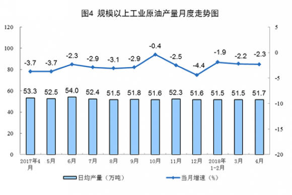 4月份,原油生产1551万吨,同比下降2.3%,降幅比上月扩大0.1个百分点;日均产量51.7万吨,比上月增加0.2万吨。