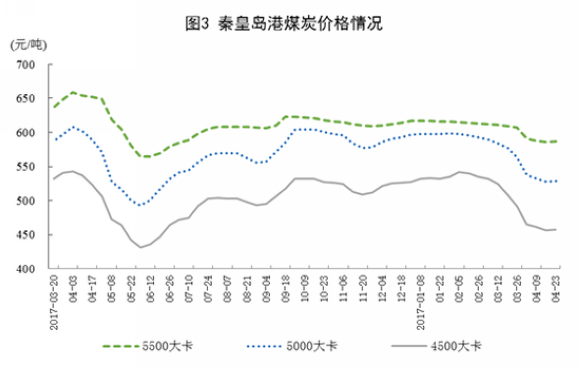 煤炭价格有所下跌。截至4月底,秦皇岛5500大卡煤炭平仓价为每吨587元,比3月底下降20元;5000大卡每吨529元,下降35元;4500大卡每吨457元,下降34元。