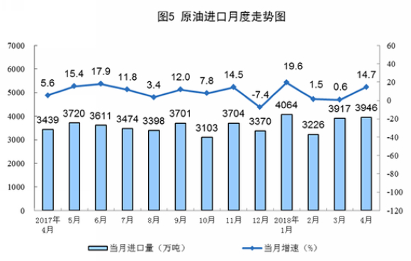4月份,原油进口大幅增长,进口3946万吨,同比增长14.7%,增速比上月加快14.1个百分点;日均进口131.5万吨,再创历史新高。1-4月份,进口原油1.5亿吨,同比增长8.9%。