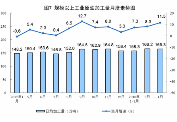 受去年同期大型石化企业停产检修较多,以及今年原油进口配额和成品油出口配额均大幅增加等多重因素影响,原油加工量增长较快。4月份,原油加工量4958万吨,同比增长11.5%,比上月加快3.2个百分点;日均加工165.3万吨,比上月减少0.9万吨。
