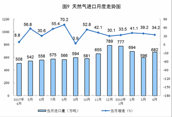 天然气进口连续7个月保持30%以上的高速增长。4月份,天然气进口682万吨,同比增长34.2%,增速比上月回落5个百分点。1-4月份,进口天然气2742万吨,同比增长36.4%。