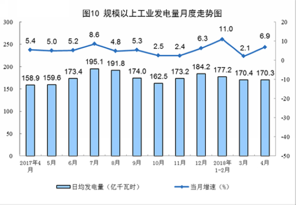 分品种看,火电增速加快,水电降幅收窄。4月份,火电增长7.3%,增速比上月加快5.9个百分点;水电下降2.6%,降幅收窄2.7个百分点;核电增长6.5%,加快4.8个百分点;风电、太阳能发电保持两位数高增长,分别增长22.6%、26.4%。