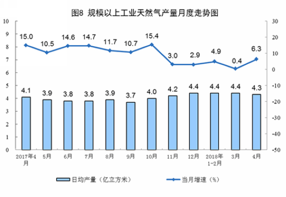 4月份,天然气生产保持高位,产量128.9亿立方米,同比增长6.3%,增速比上月加快5.9个百分点;日均生产4.3亿立方米,比上月减少0.1亿立方米。