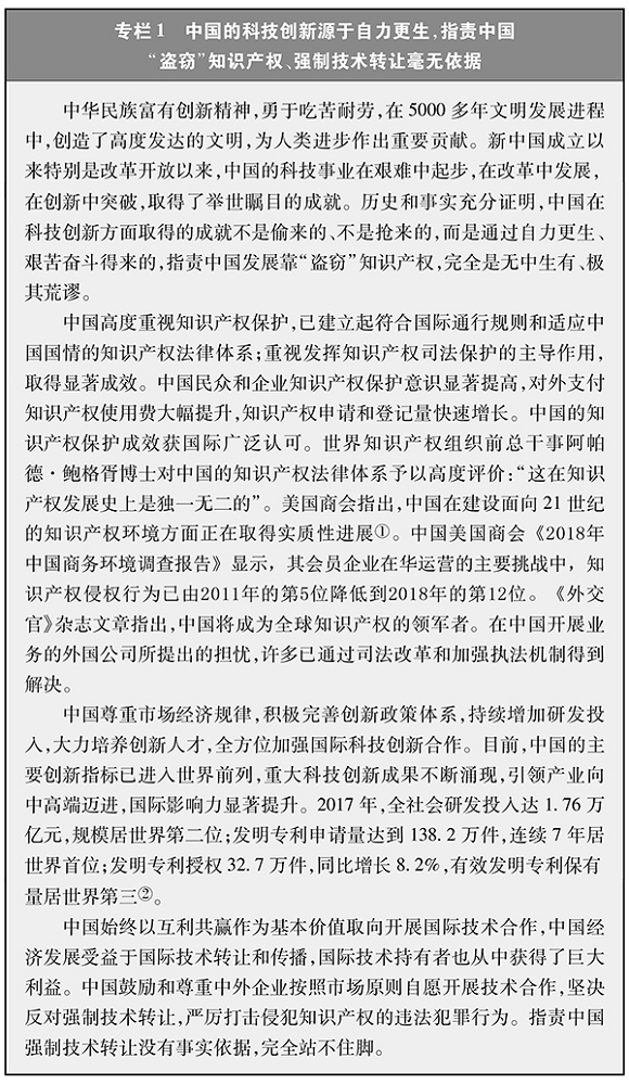 现任美国政府奉行“美国优先”政策,对外采取一系列单边主义和保护主义措施,动辄使用关税“大棒”,将自身利益诉求强加于他国。美国启用尘封多年的“201调查”“232调查”等手段,对各主要贸易伙伴频频出手,搅乱全球经贸格局。美国还将矛头对准中国,于2017年8月启动单边色彩浓厚的“301调查”,无视中国多年来在加强知识产权保护、改善外资营商环境等方面的不懈努力和取得的巨大成绩,对中国作出诸多不客观的负面评价,采取加征关税、限制投资等经贸限制措施,挑起中美经贸摩擦。