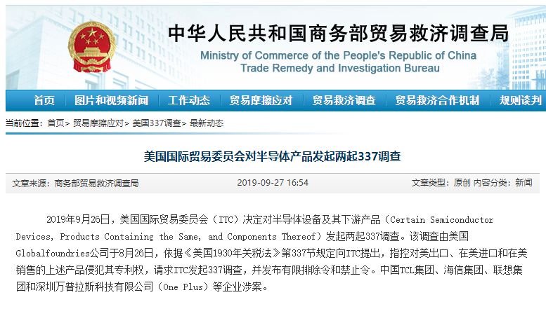 据商务部贸易救济调查局消息,该调查由美国Globalfoundries公司于8月26日,依据《美国1930年关税法》第337节规定向ITC提出,指控对美出口、在美进口和在美销售的上述产品侵犯其专利权,请求ITC发起337调查,并发布有限排除令和禁止令。中国TCL集团、海信集团、联想集团和深圳万普拉斯科技有限公司(One Plus)等企业涉案。(注:“万普拉斯”即网友熟知的一加科技)