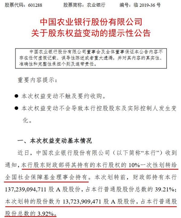 9月25日晚间,先是中国农业银行发公告称,该银行股东财政部将其持有的本行股权的10%一次性划转给全国社会保障基金理事会持有。本次划转的股份数为13723909471股A股股份,占该银行普通股股份总数的3.92%。按照农行A股9月25日收盘价3.46元计算,财政部此次划转给社保基金会的股权价值超474.8亿元。