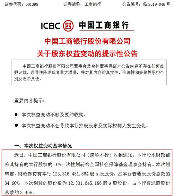 紧随农行之后,中国工商银行银行发布公告称,近日,该银行收到通知,股东财政部将其持有的工商银行股权的10%一次性划转给全国社会保障基金理事会持有。本次划转前,财政部持有工行123316451864股A股股份,占该银行普通股股份总数34.60%;本次划转的股份数为12331645186股A股股份,占该银行普通股股份总数的3.46%。按照工商银行9月25日A股收盘价5.49元计算,此次划转股权价值超677亿元。