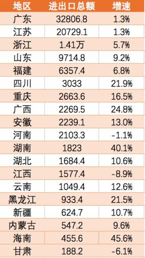 在已公布外贸数据的19个地区中,广东和江苏的进出口总额分别达到了32806亿元、20729.1亿元,上半年进出口总额仍然遥遥领先全国,两省上半年的外贸增速同比皆为1.3%。