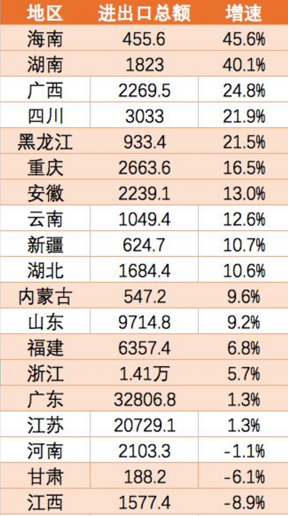从增速上看,上半年表现最突出的是海南与湖南,分别增长45.6%、40.1%,也是目前仅有的两个增速突破40%的省份。21世纪经济报道记者注意到,海南、湖南两地超过40%的高增速,与两地参与“一带一路”和民营企业出口快速发展密切相关。