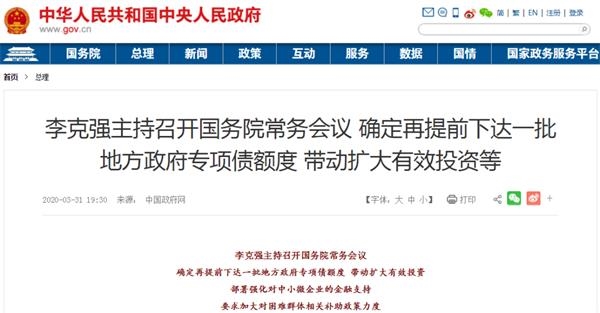 据央视新闻,国务院总理李克强3月31日主持召开国务院常务会议,确定再提前下达一批地方政府专项债额度,带动扩大有效投资;部署强化对中小微企业的金融支持;要求加大对困难群体相关补助政策力度。