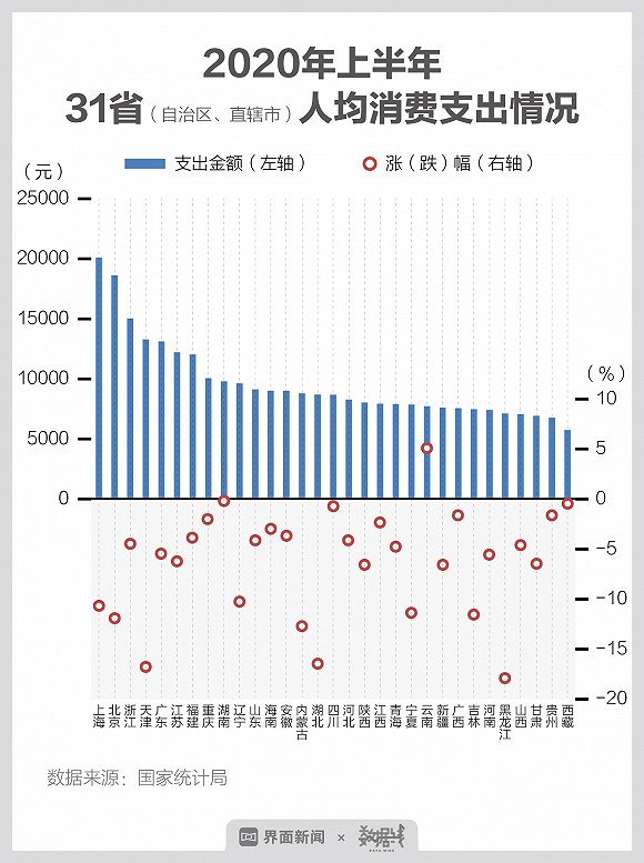 国家统计局数据显示,上半年,全国居民人均消费支出9718元,比上年同期名义下降5.9%,扣除价格因素,实际下降9.3%。31个省份中,9个省份超过全国平均水平,数量和去年持平,8个省份突破1万元,比去年同期减少3个。