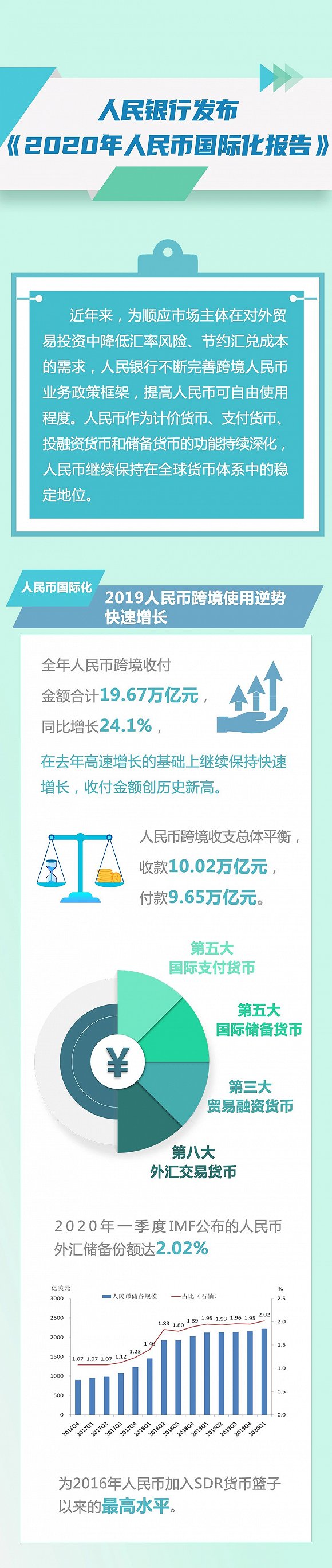 8月14日,中国人民银行发布的《2020年人民币国际化报告》指出,人民币作为计价货币、支付货币、投融资货币和储备货币的功能将继续深化,人民币将继续保持在全球货币体系中的稳定地位。全年人民币跨境收付金额合计19.67万亿元,同比增长24.1%。