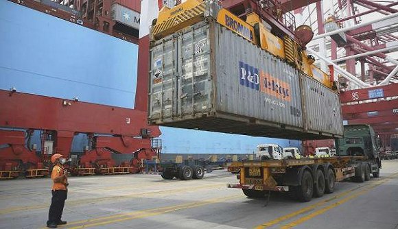 在青岛港一处集装箱码头,戴着口罩的工人正指挥龙门吊将集装箱装载上卡车。(美联社)