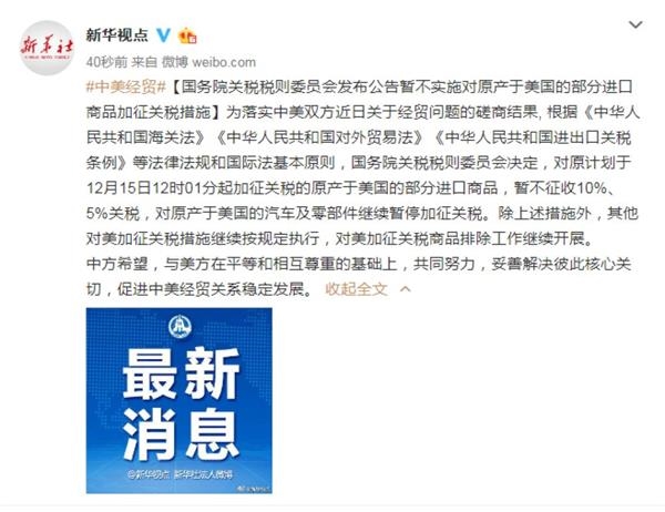 12月15日,国务院关税税则委员会决定,对原计划于12月15日12时01分起加征关税的原产于美国的部分进口商品,暂不征收10%、5%关税,对原产于美国的汽车及零部件继续暂停加征关税。除上述措施外,其他对美加征关税措施继续按规定执行,对美加征关税商品排除工作继续开展。 [详细]
