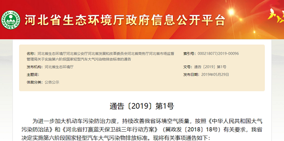 5月29日,河北省生态环境厅发布《关于实施第六阶段国家轻型汽车大气污染物排放标准的通告》。通告显示,自2019年7月1日起,在河北省销售、注册登记和外省转入的轻型汽车应当符合国六b标准。