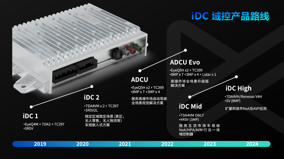 第二类叫做多场景的域控制器。多场景的域控制器系列产品可以适配不同车型,正向市场普及的iDC-Mid只用了一块TDA4的芯片,但包含了NOA(导航辅助驾驶)、HPA(自学习泊车)、APA(自动泊车)等功能,未来我们还将推出iDC-High,这是一款更高端、支持更高像素摄像头接入的域控制器。