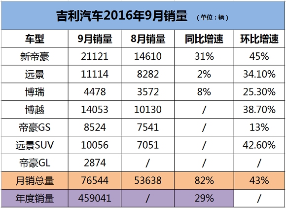 值得一提的是,吉利汽车9月份继续保持了轿车与SUV双轮驱动、两翼齐飞的良好发展态势。在吉利汽车9月76544辆的销量中,SUV车型贡献了32633辆,占比约43%。作为SUV战略发展的元年,吉利汽车今年接连推出了博越、帝豪GS和远景SUV三款SUV产品,并均在各细分市场占据一席之位。