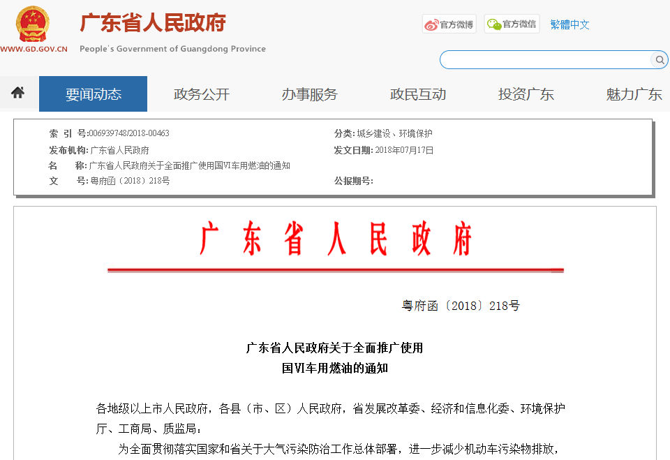 为全面贯彻落实国家和广东省关于大气污染防治工作总体部署,进一步减少机动车污染物排放,改善广东省空气环境质量,按照国家关于加快油品升级的部署,根据广东省油品供应的实际情况,省政府决定提前在全省范围内推广使用国VI车用燃油。现将有关事项通知如下: