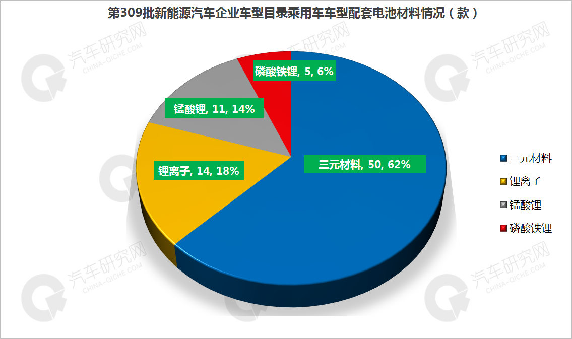 发布的新能源乘用车车产品中,电池材料主要集中在三原材料类型,共计50款车型配套此种类电池,占本次车型目录六成以上;其次是锂离子和锰酸锂电池,均有10款以上产品采用此类型配套电池;磷酸铁锂类型电池本次目录中产品使用率较低。