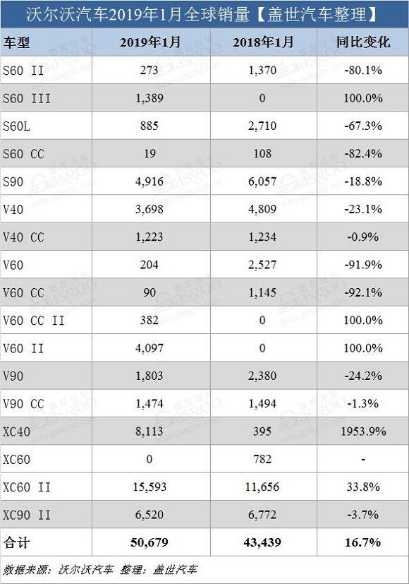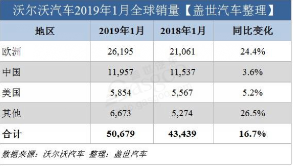 根据沃尔沃汽车官方公布的数据,2019年1月份,沃尔沃汽车全球销量较去年同期增长16.7%,总量达50,679辆。沃尔沃汽车指出,包括美国、中国和欧洲在内的所有主要地区都实现了增长。