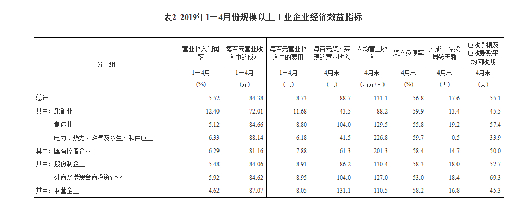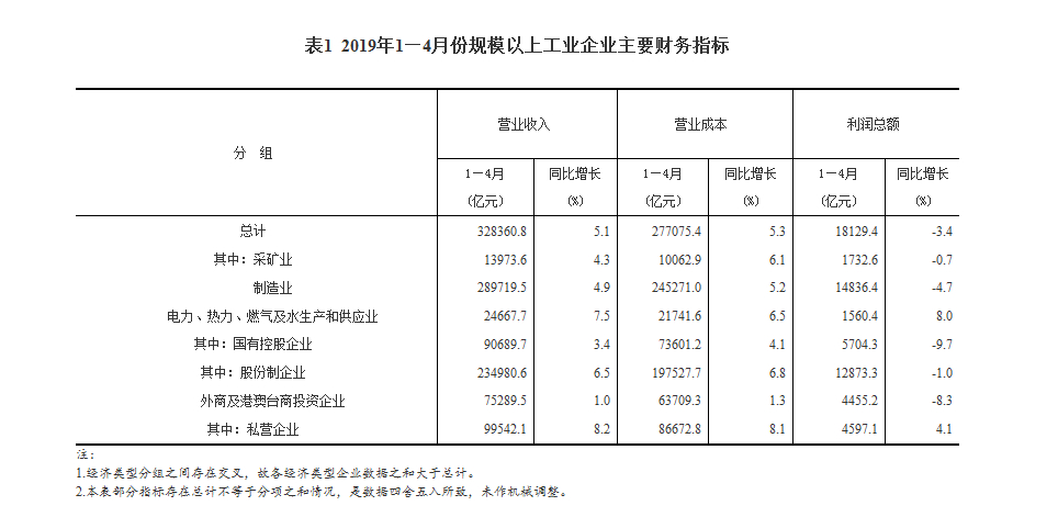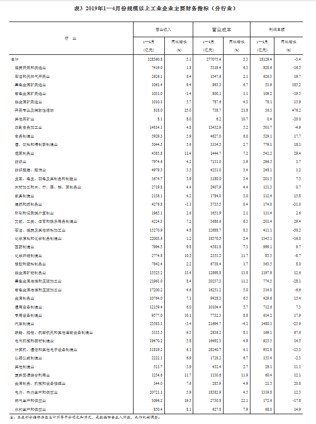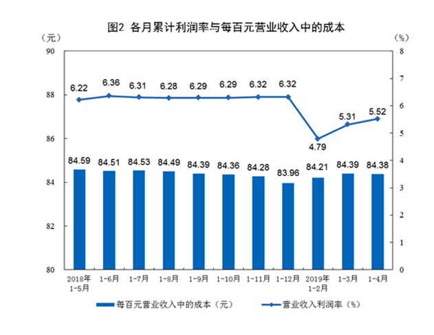1—4月份,规模以上工业企业实现营业收入32.84万亿元,同比增长5.1%;发生营业成本27.71万亿元,增长5.3%;营业收入利润率为5.52%,同比降低0.48个百分点。