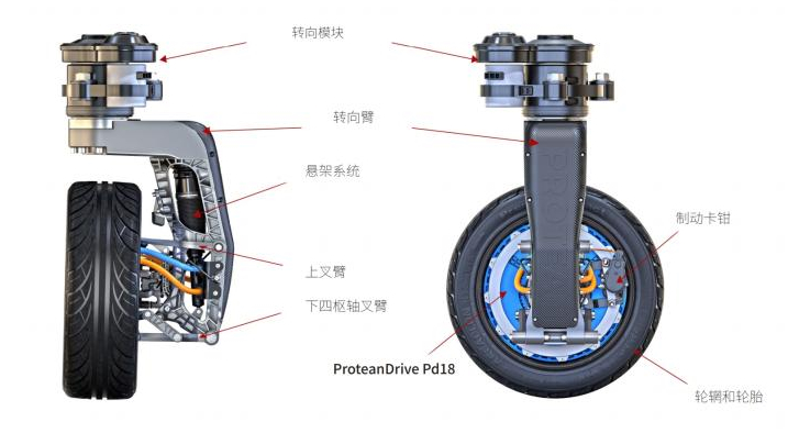 该模块中的轮毂电机为该公司生产的ProteanDrive Pd18电机,该电机可以安装在18英寸的轮圈内部,电机类型为永磁同步电机,该电机系统中集成了逆变器、液冷系统、刹车卡钳和刹车盘。其最大功率为80kW(109Ps),峰值扭矩为1250N·m,若一辆车使用4个这样的模块,整车可达到的最大功率为320kW(436Ps),峰值扭矩为5000N·m,从动力参数来看,可以满足城市公共出行的使用场景。