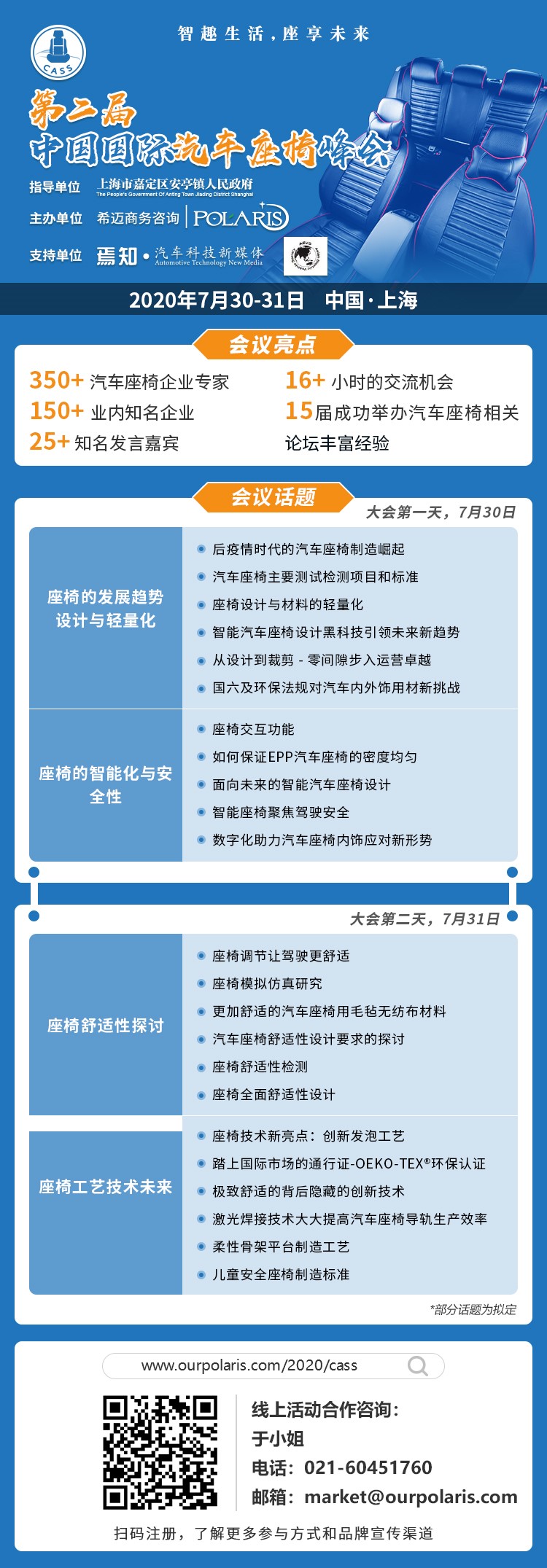 由希迈商务咨询(上海)有限公司主办,上海市嘉定区安亭镇人民政府指导,焉知汽车科技新媒体和亚太电动车协会支持的第二届中国国际汽车座椅峰会将于7月30-31日在上海召开。