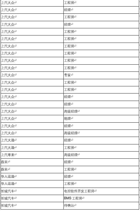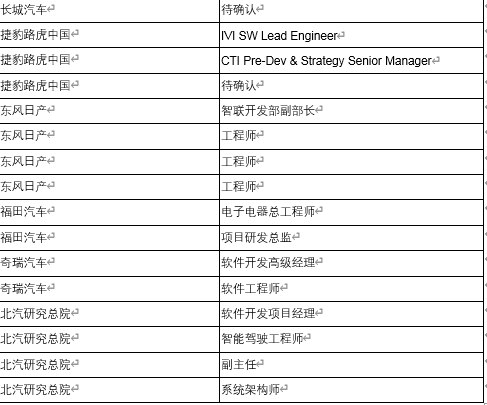 董事长,副董事长,总裁、副总裁、首席技术官、软件开发总经理、电子电器负责人,远程控制单元负责人,项目经理、汽车电子市场经理、产品经理、座舱软件开发经理、软件设计,软件工程师、软件架构师、研发中心副总监、研发主任、车载互联信息娱乐系统主管、诊断主管工程师、应用支持工程师、主任工程师、软件项目经理、自动驾驶工程师、功能安全专家、SOTIF、产品开发、电子系统及软件开发、电气架构等。
