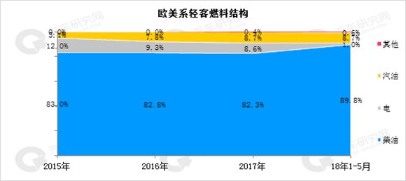 从燃料结构变化来看,柴油车型仍旧是市场主力,目前占比为89.8%;汽油车占比较少,占比维持在8%左右,但近年来呈现逐年增长态势;纯电动车型市场近年来快速增长,占比已超过汽油车,受“骗补”风波和新能源补贴下滑影响,增速明显下滑。