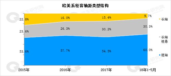 从轴距类型看,长轴短悬车型保持稳定增长,占比目前增至30.3%;短轴车型1-5月快速回升,从2017年的54.5%增至目前的60.0%;长轴车占比延续下滑趋势,目前占比已降至不足10%。
